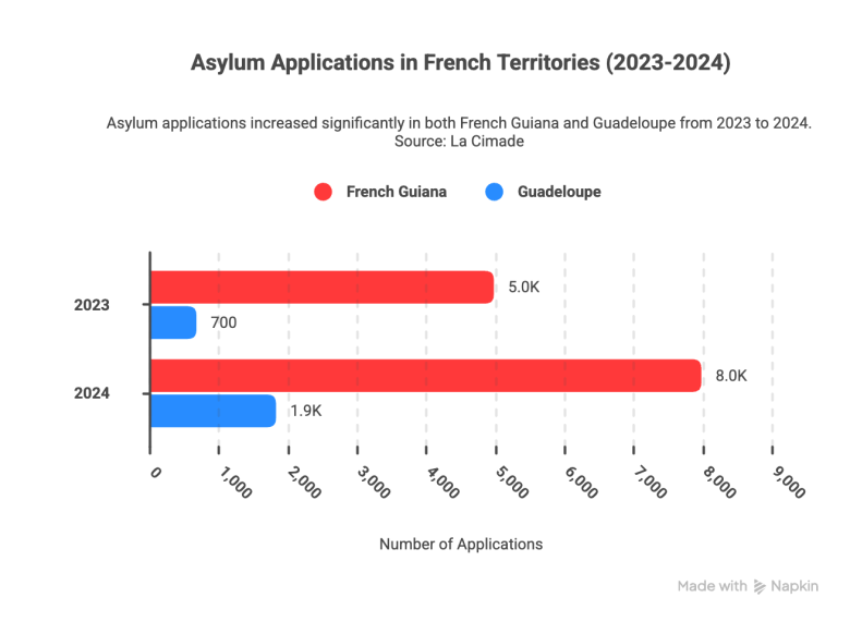In French Guiana, asylum functions jumped from 5,000 in 2023 to eight,000 in 2024. Requests in Guadeloupe rose from roughly 700 to 1,850. As of October 2025, French Guiana had already recorded 7,500 functions. Total, advocates are saying the development has stabilized however not slowed.